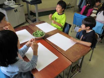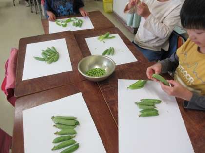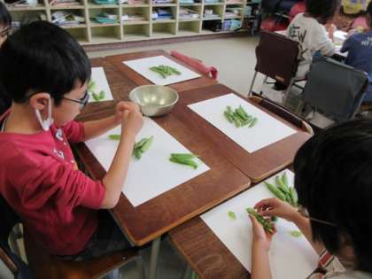 2年生が今日の給食で使う、グリーンピースのさや向きをしました。