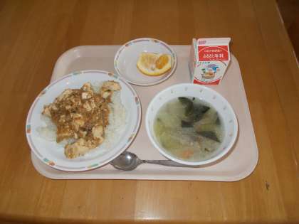 麻婆豆腐丼 キャベツのスープ いよかん 牛乳