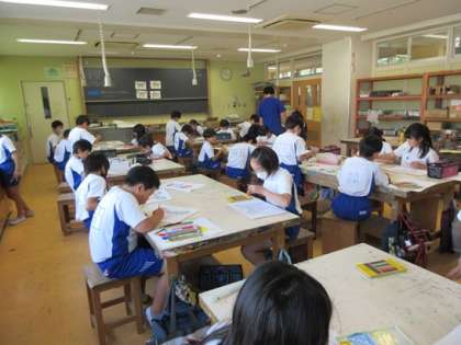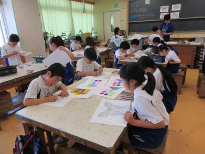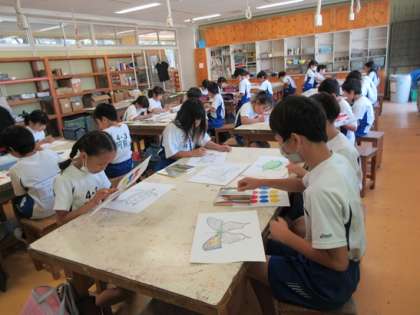 色鉛筆や絵の具を使い、細かな模様を塗っていきます。