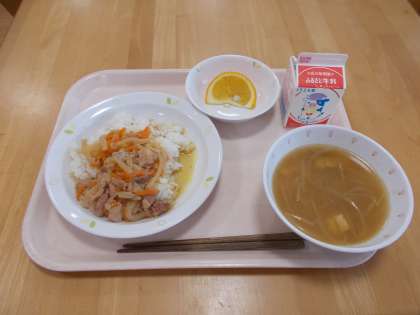 鶏肉のうま煮丼 玉ねぎのみそ汁 甘夏 牛乳