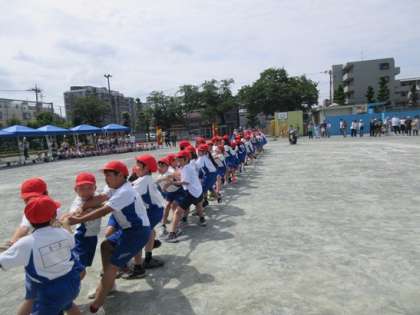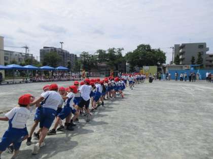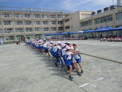 合図とともに、3年生同士で綱を引き始め、4年生は校庭を半周して引き手に加わります。