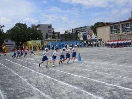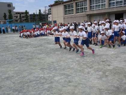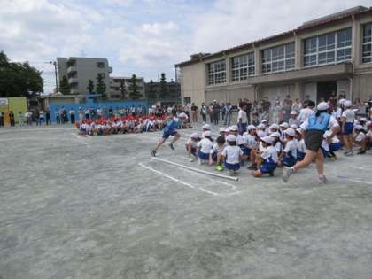 5・6年生の団体競技は、「台風の目」という、昔ながらの競技です。4・5人で竹の棒をもちコーンを廻旋し、足元と頭の上を通してのリレーです。