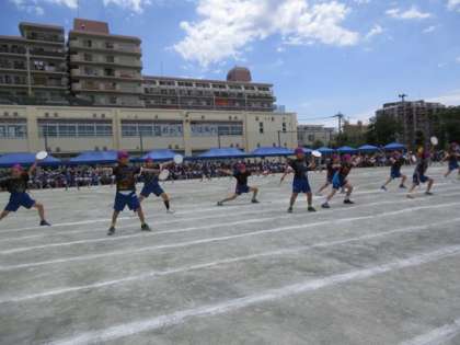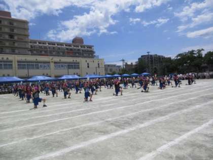 4年生の演技種目は「エイサー」です。今年は例年に比べると、アップテンポな選曲です。次から次へと跳ね回る4年生です。