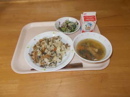 カリカリお豆のひじきごはん 野菜のゆかりかけ 吉野汁 牛乳