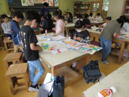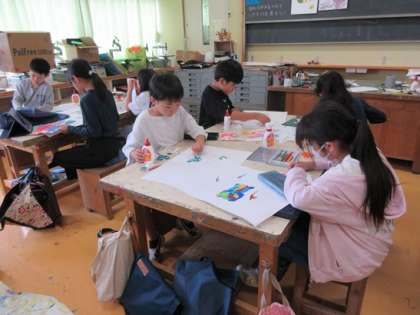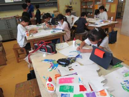 下書きをしてある絵に、不思議な模様になっている画用紙を切り抜き張り付けています。