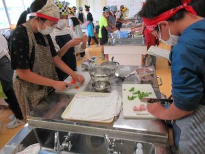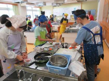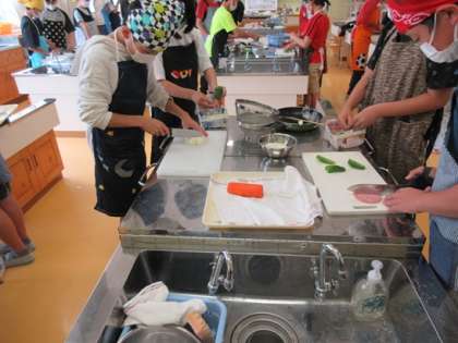 野菜炒めを作るようです。使う材料は、にんじん、玉ねぎ、ピーマン、ハムの4種類。