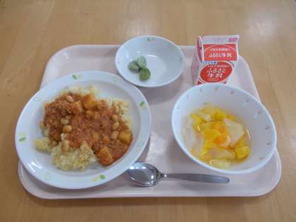 チリビーンズライス ゆでそら豆 フルーツ寒天 牛乳
