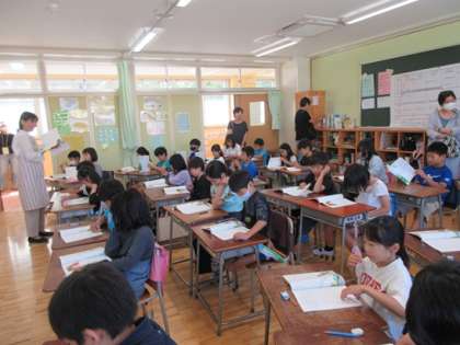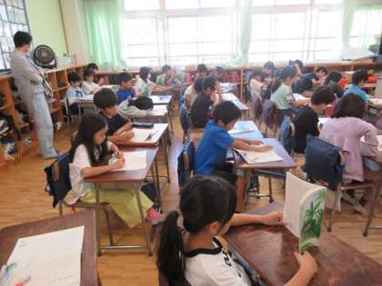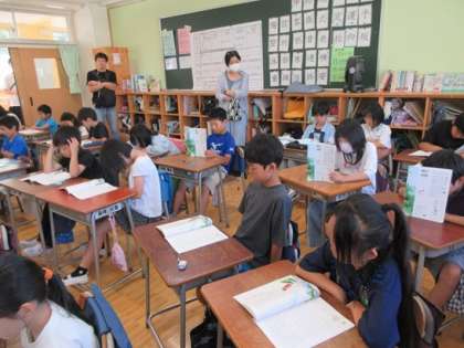 物語単元で、先生の音読を聞きながら、自分で黙読しています。