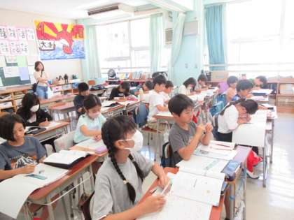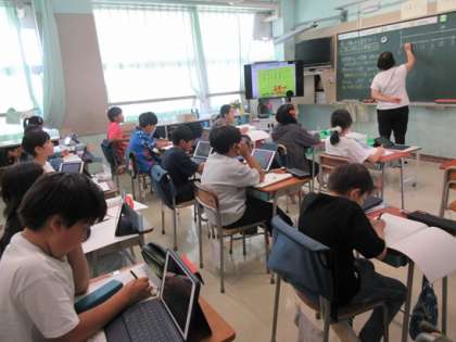 5年生の少人数算数の時間です。小数を整数にする手続きの方法について確かめています。