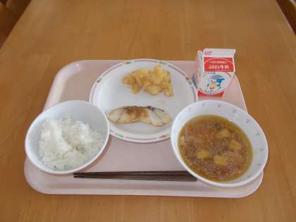 ごはん 魚のステーキソース 甘辛ポテト けんちん汁 牛乳