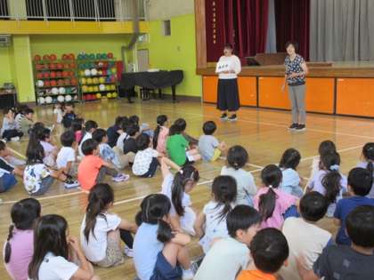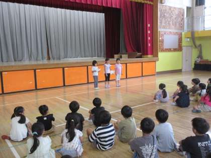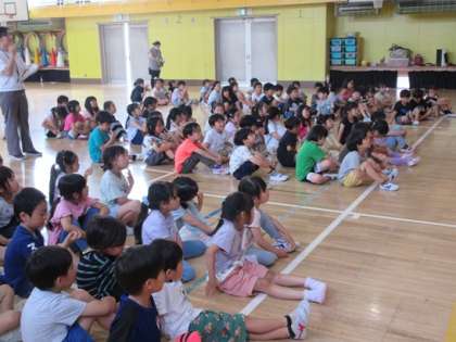1年生のプール開きです。代表の子どもが決意の言葉を言いました。