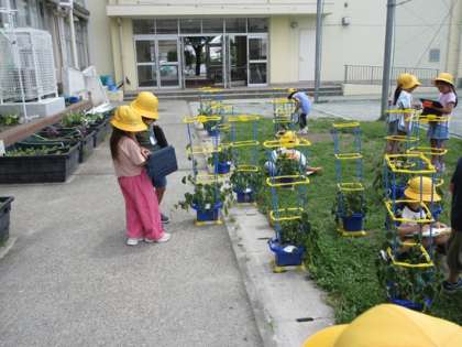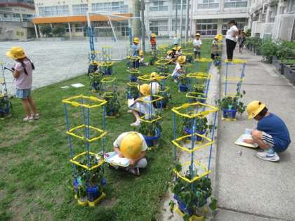 アサガオの植木鉢の観察です。タブレットで撮影した後に、観察カードに記入します。
