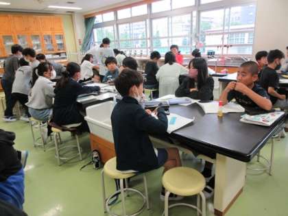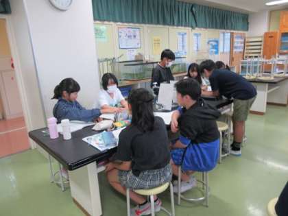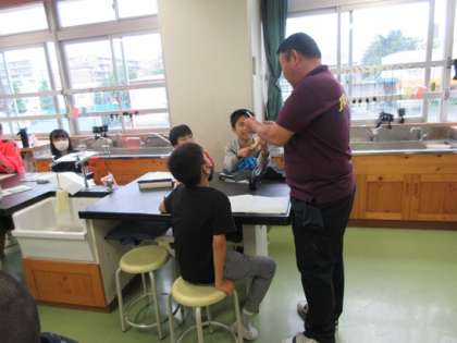 吸う前の空気と吐き出した空気を、気体検知管を使用して、変化の様子を確かめています。