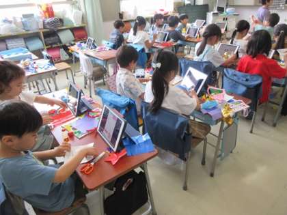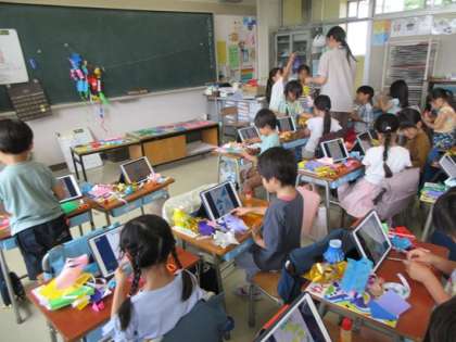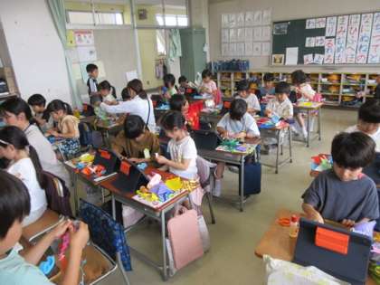 折り紙を使って、切ったり、折ったりして、様々な飾りを作っています。