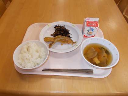 ごはん シシャモのカレーフライ ひじきの煮物 小松菜のすまし汁 牛乳