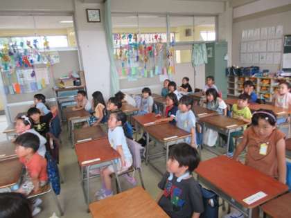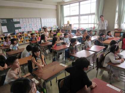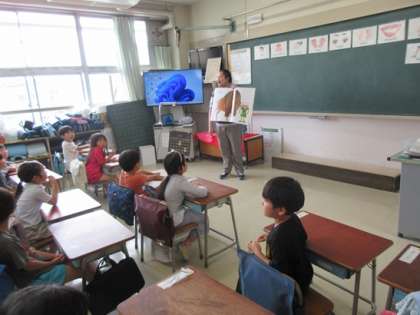 ALTの先生が大型絵本を広げ、出てくる動物を英語で答えます。