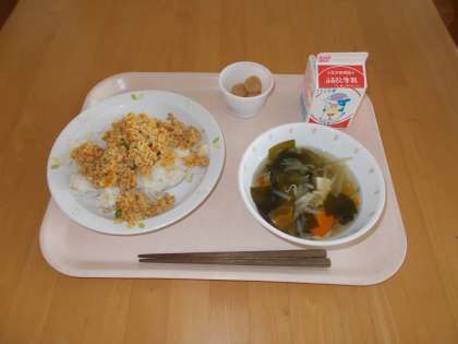 ふわふわそぼろ丼 わかめスープ 白玉きなこ 牛乳