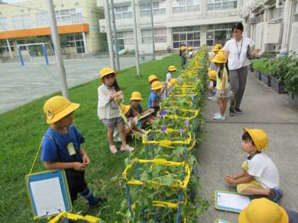 職員室前のアサガオの観察です。色とりどりの花が咲きました。