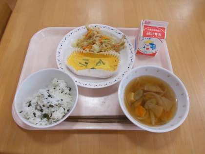 わかめごはん 千種焼き 野菜のごまだれかけ けんちん汁 牛乳