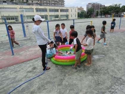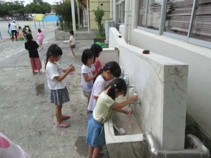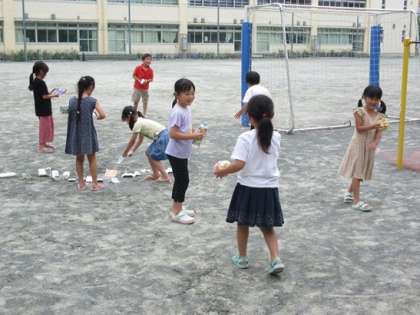 昇降口前のところで、マヨネーズの容器やスポンジなどを使って、水遊びです。