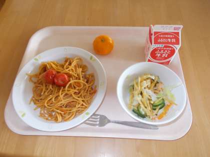 あっちとボンの水玉スパゲッティ じゃがいもののバリバリサラダ 冷凍みかん 牛乳