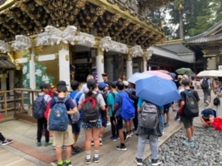 陽明門前で記念撮影。陽明門をくぐり、眠り猫などを見ました。