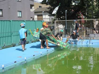 せっかくの機会なので、参加予定の児童とともにプールに出廷予定のいかだを浮かべ、ミニレースを実施しました。