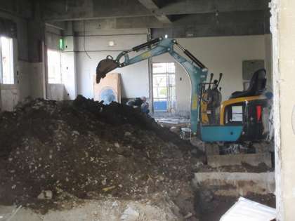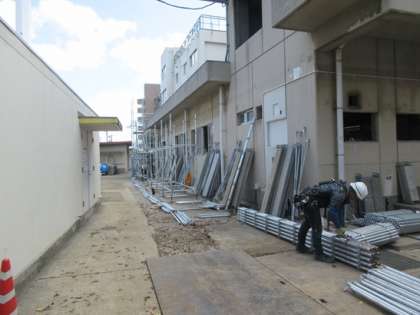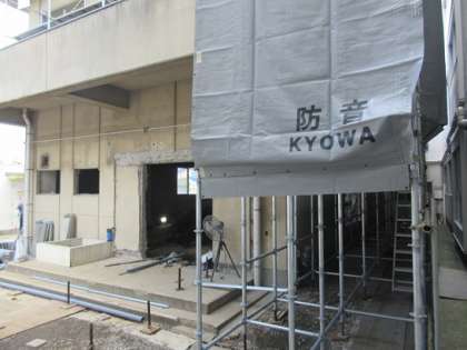 給食室の工事進捗状況です。給食室の中は床も全部はがされ、何もありません。周りに足場組まれ、次の作業工程へと入るようです。