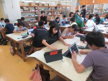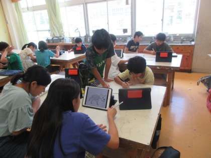 今回の製作テーマは恐竜の化石です。タブレットを利用して、様々な恐竜の化石の動画を元に、題材を決めていました。