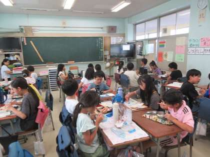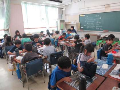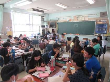班ごとにお弁当を広げ、遠足気分での食事のようです。