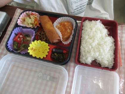 上段 玉子屋さんのお弁当です。ご飯の量については、高学年は少ないと感じている子が結構います、おかずが豊富です。