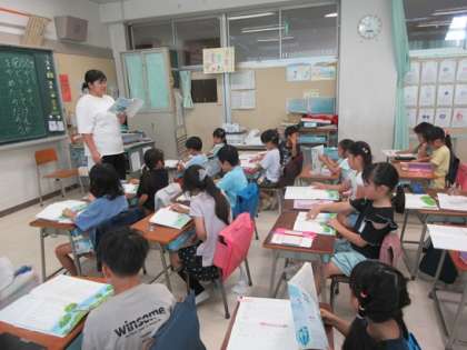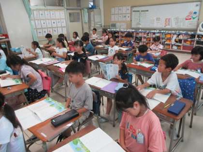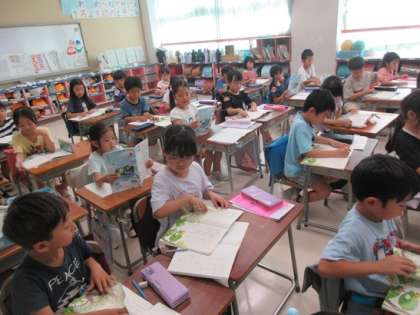お話を、列ごとで音読します。友達と上手に声を合わせることができるかな。
