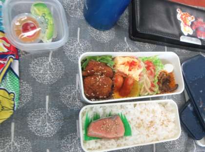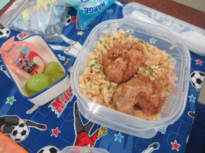 中段 お弁当に欠かせない唐揚げ、果物が光ります。