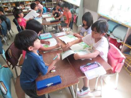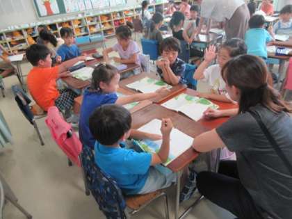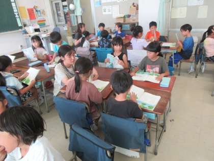 班ごとに分かれて、音読発表会の役割分担を相談しています。