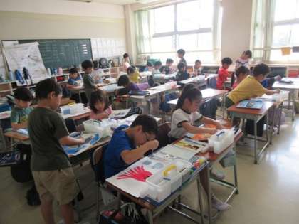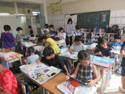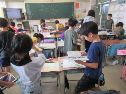 クレパスで書いたところに水彩絵の具を塗り、動物の絵を仕上げていました。