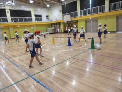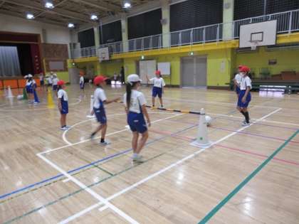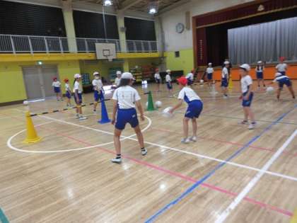 ネット型のプレルボールに取り組んでいます。ボールを地面にたたきつけるようにして。相手コートへボールを運びます。