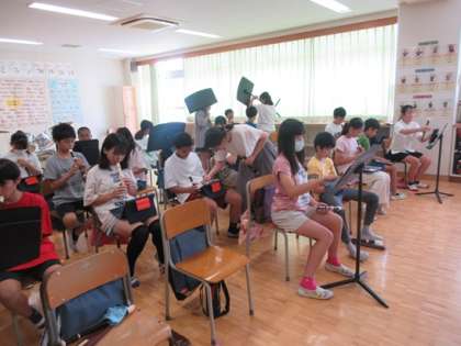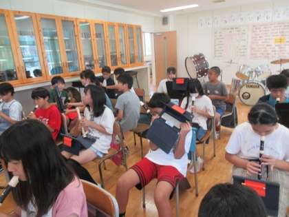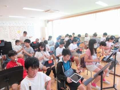 リコーダーを吹き、タブレットで録音、出来栄えを確認しています。