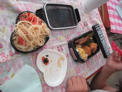 上段 ハート形のお弁当箱にいっぱいに、パスタが詰まっています。