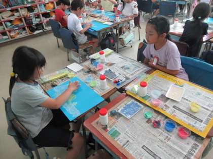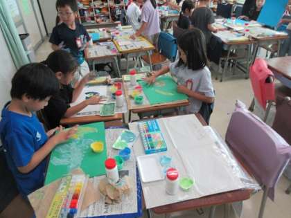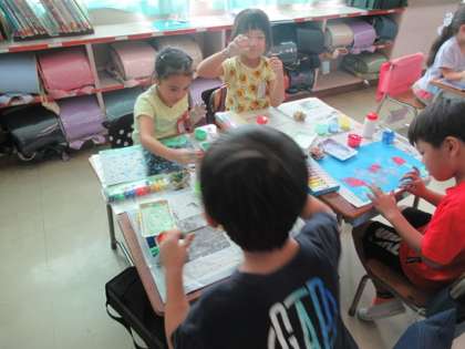 かぷにいれたえんぐをゆびにつけ、画用紙に絵を描いています。