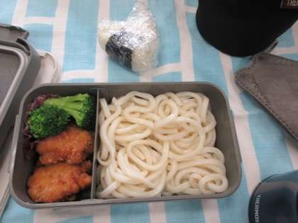 上段 うどんです。おにぎりもあり、ボリューム感いっぱいです。