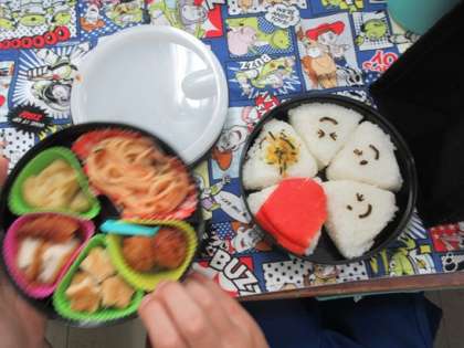 中段 おにぎりにびっくり、表情が何とも言えませ。