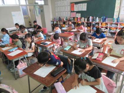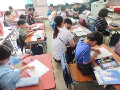 宝取りゲームの振り返りをしています。楽しかったことや頑張れたことをカードに書きます。