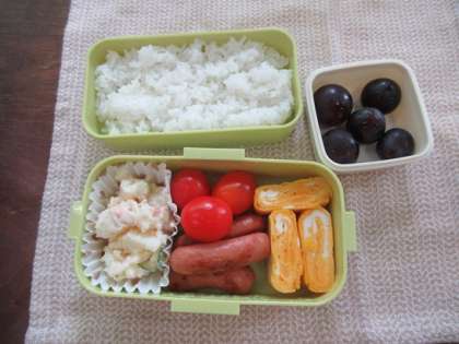 下段 玉子とソーセージ プチトマトがピカピカです。