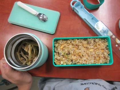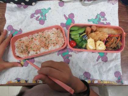 中段 ふりかけご飯、玉子焼き、ソーセージ 揚げ物 お弁当のよさがいっぱいです。