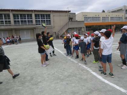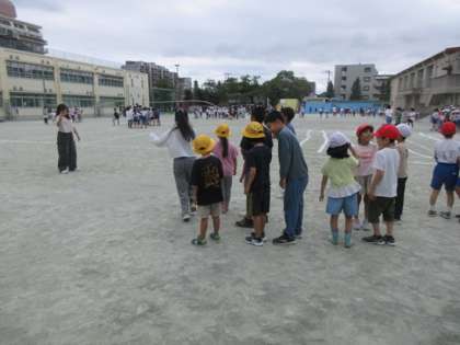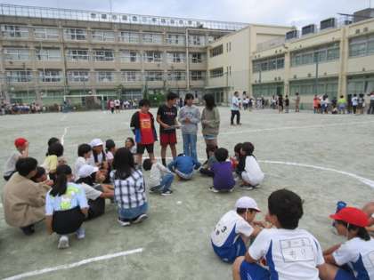 校庭に出た版の活動の様子です。6年生が中心となり、遊びをリードしていました。