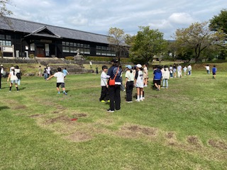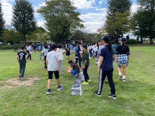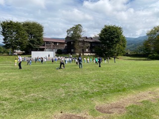 民族資料館前の芝生広場で 交流担当の子供達が企画していた遊びをしました。天気が良く元気に体を動かしました。