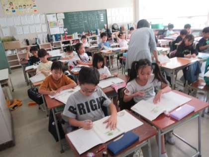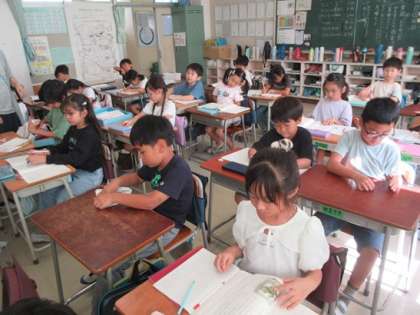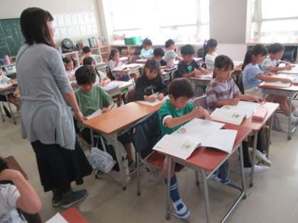 「がまくんとかえるくん」のお話を読み、登場人物の気持ちを考えています。