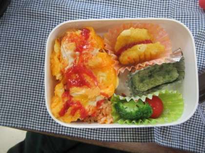 上段 ケチャップの赤とブロッコリーの緑が食欲をそそります。
