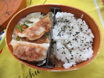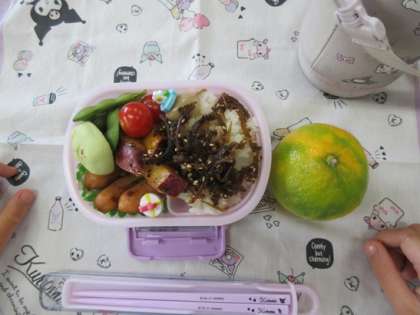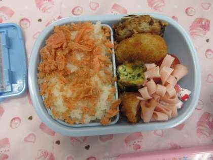 上段 鮭ご飯ですね。花のようなおかずはハムの細工ですね。