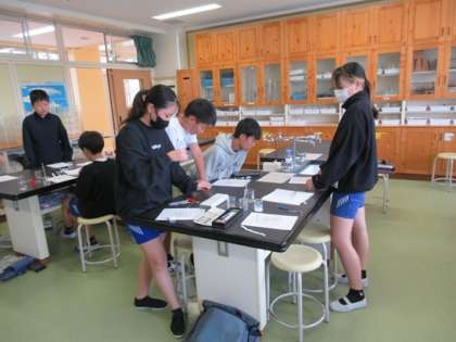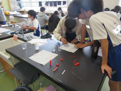 リトマス試験紙を使い、複数の水溶液の性質を確認しています。
